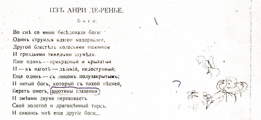 Рамка вокруг «анютиных глазок» и знак вопроса — позднейшие владельческие маргиналии. Рисунок карандашом из пяти упомянутых в тексте богов представляет третьего — нагого и крылатого. Ниже — пятый бог со змеями и анютиными глазками.